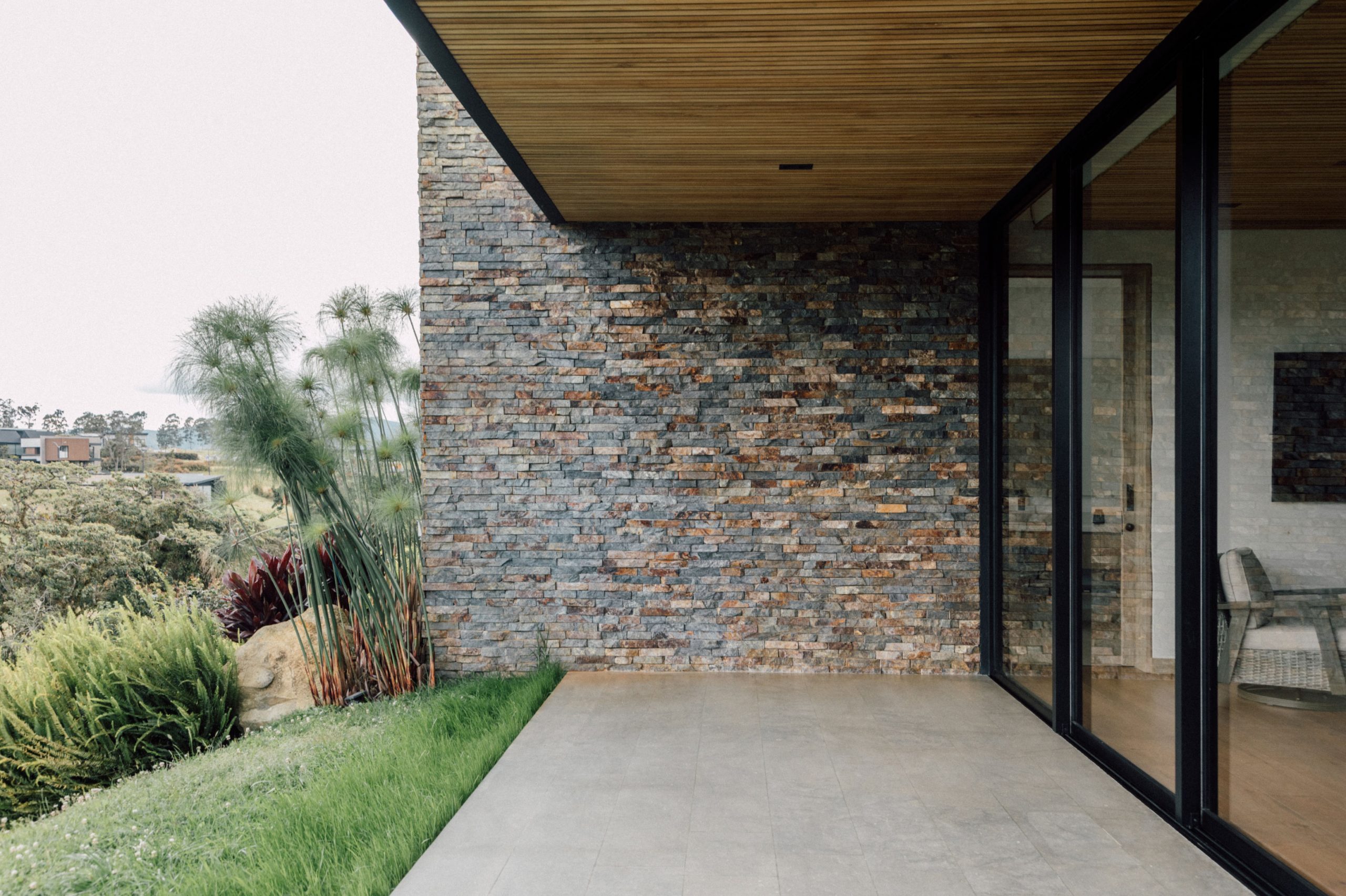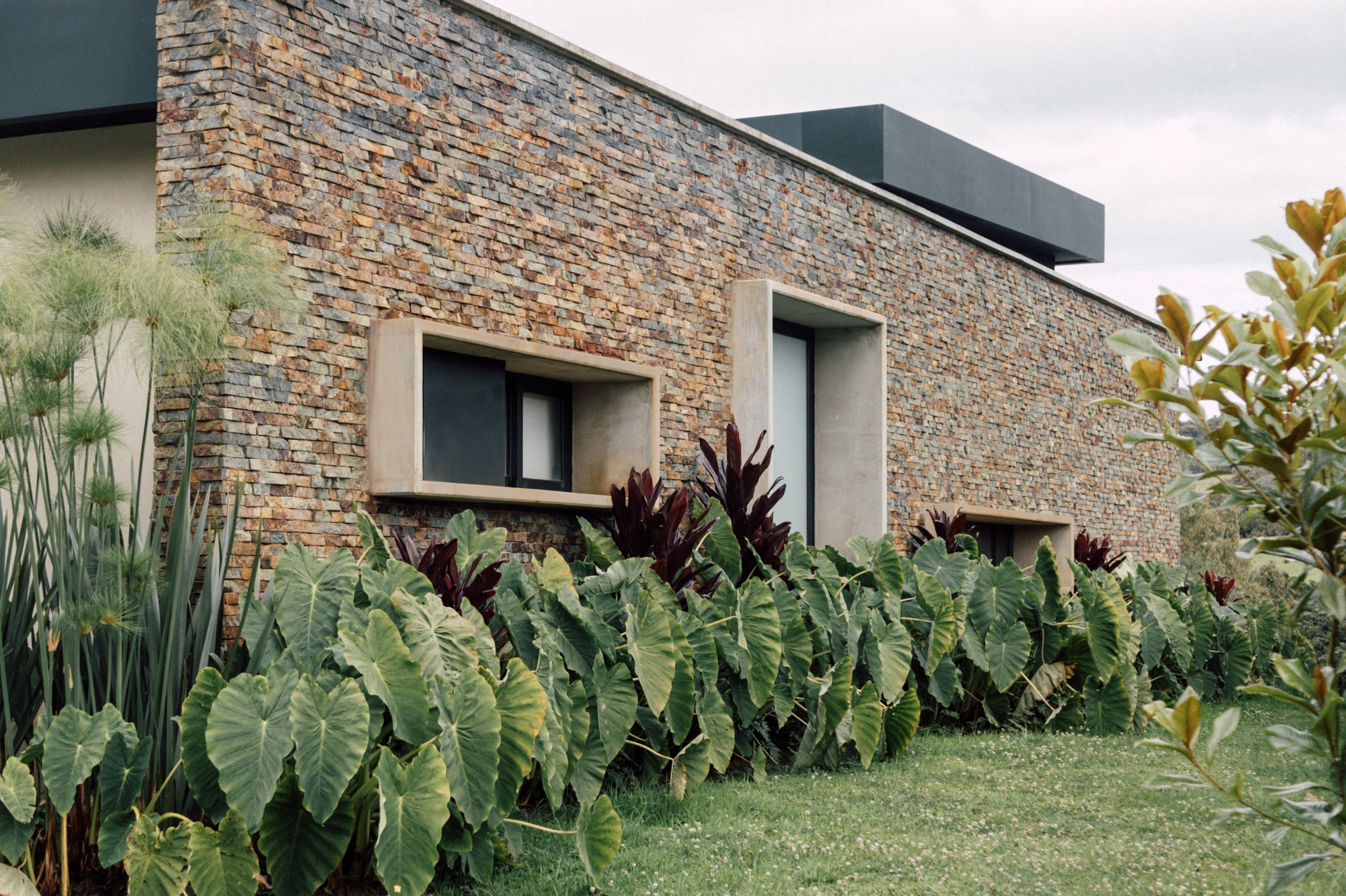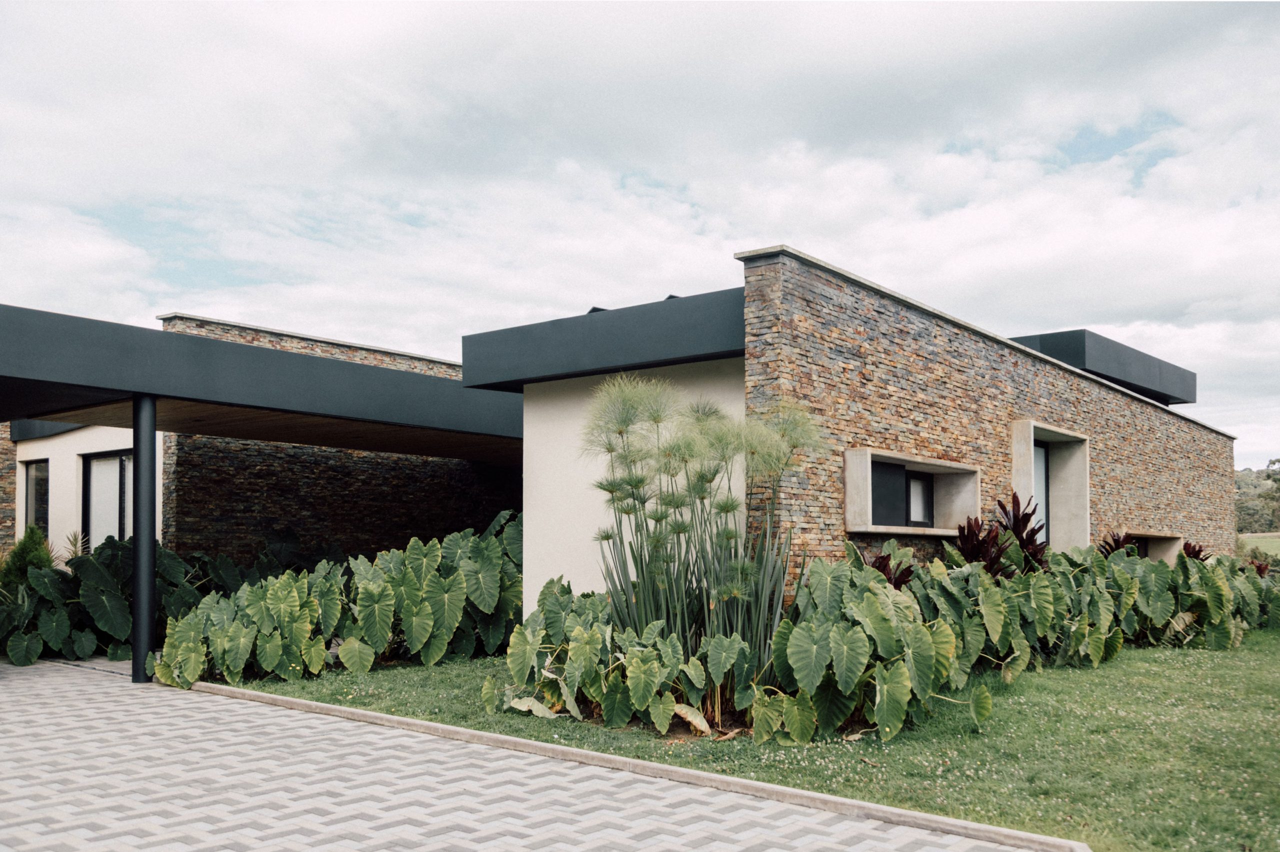 Las cubiertas, cuidadosamente ocultas en el lenguaje del proyecto, refuerzan la horizontalidad del conjunto y su discreta presencia en el paisaje. Las ventanas enmarcadas en concreto emergen de los muros pétreos como gestos escultóricos que modulan la luz, brindan privacidad y otorgan identidad a la fachada.
