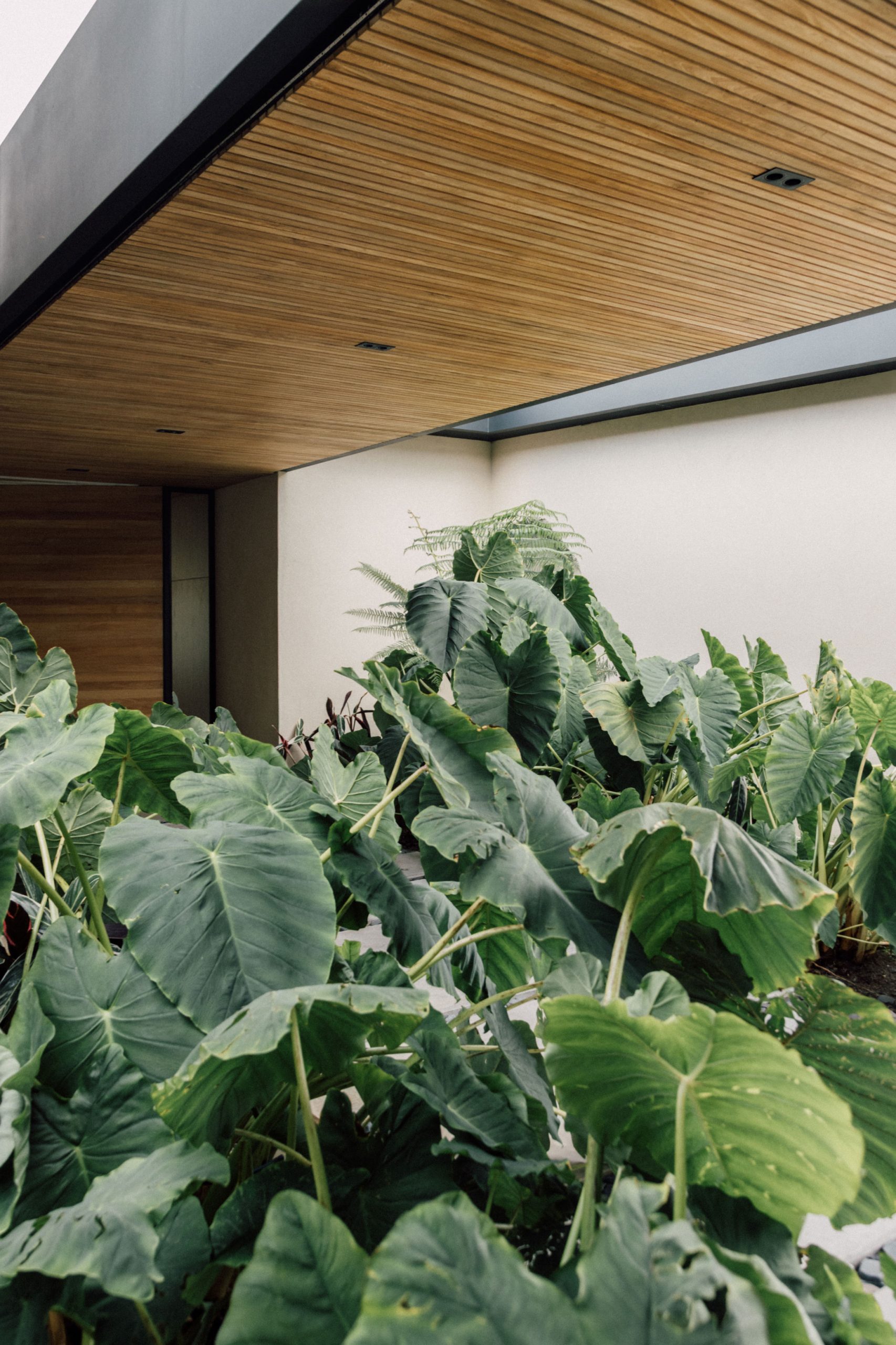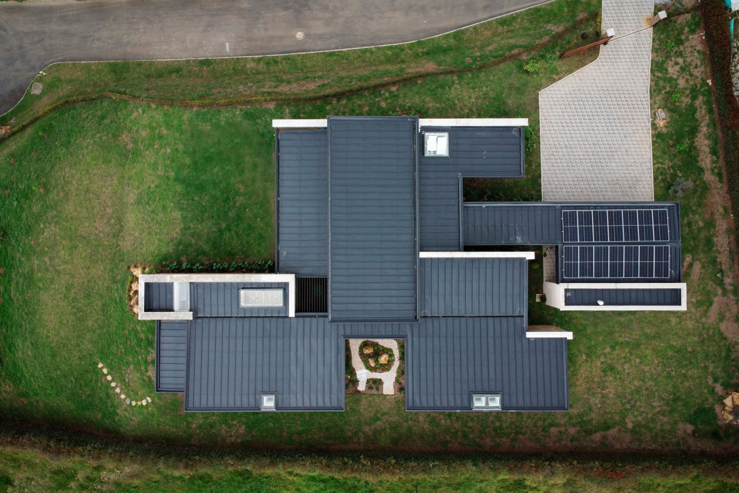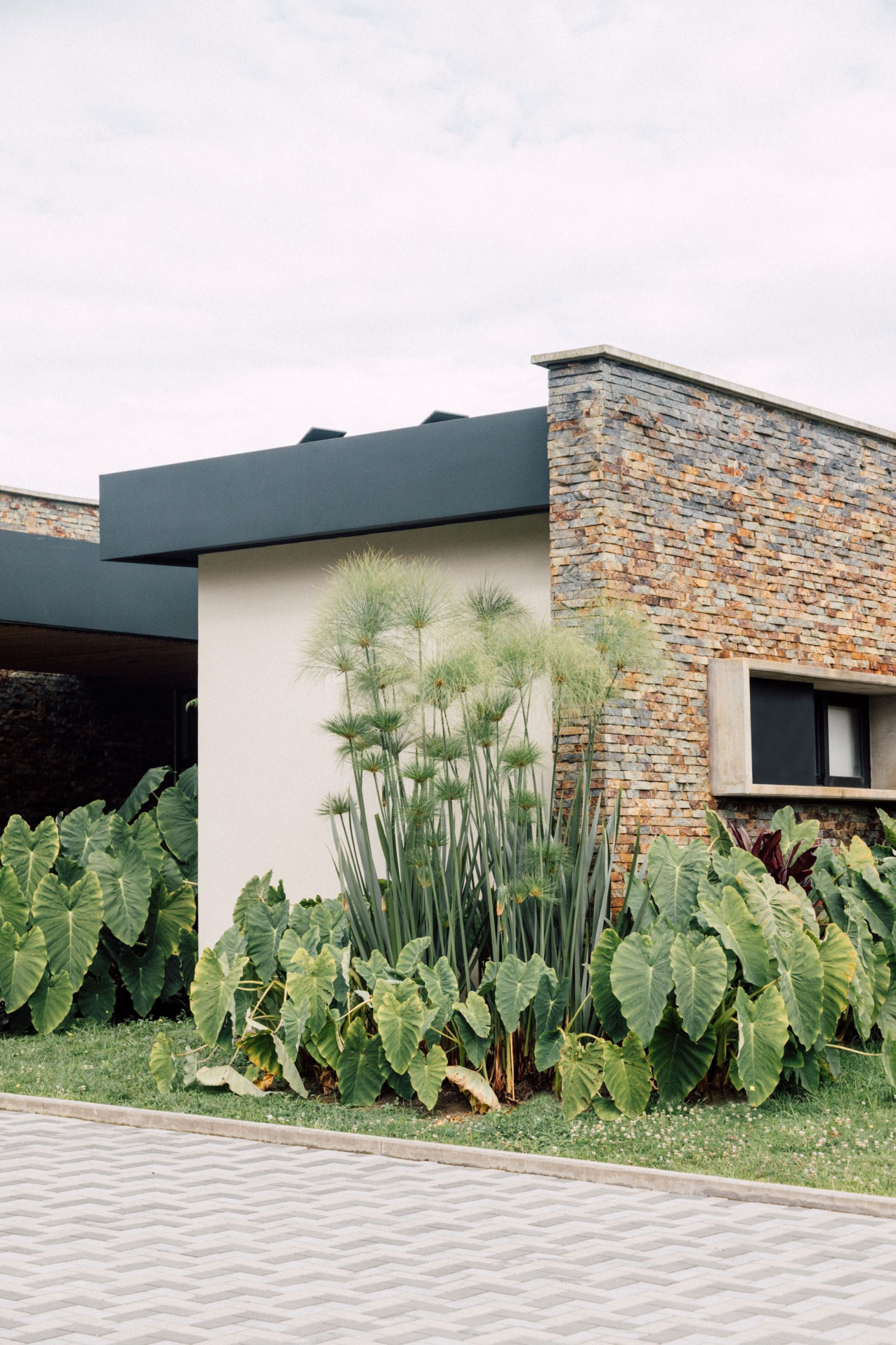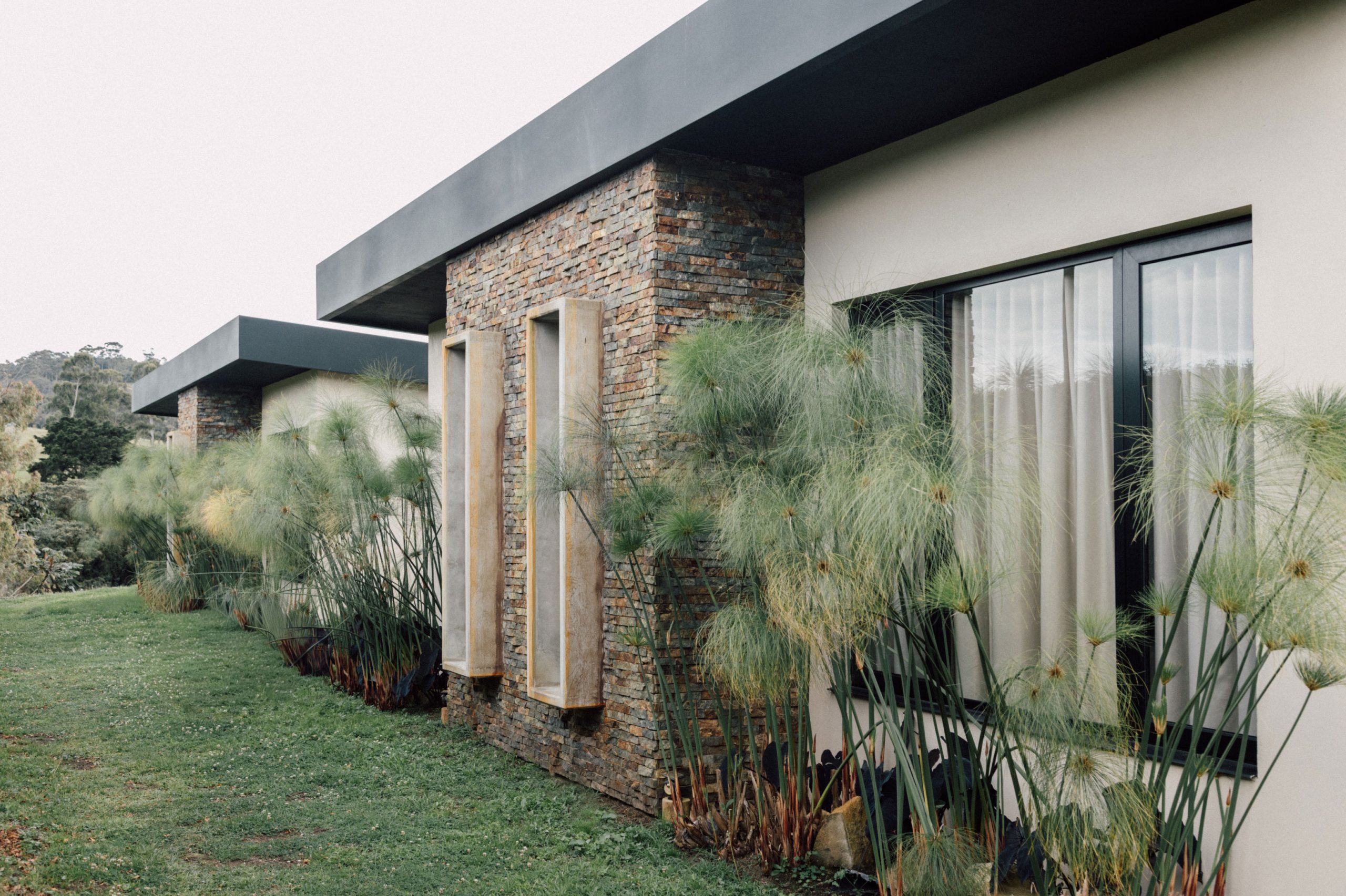 Las cubiertas, cuidadosamente ocultas en el lenguaje del proyecto, refuerzan la horizontalidad del conjunto y su discreta presencia en el paisaje. Las ventanas enmarcadas en concreto emergen de los muros pétreos como gestos escultóricos que modulan la luz, brindan privacidad y otorgan identidad a la fachada.