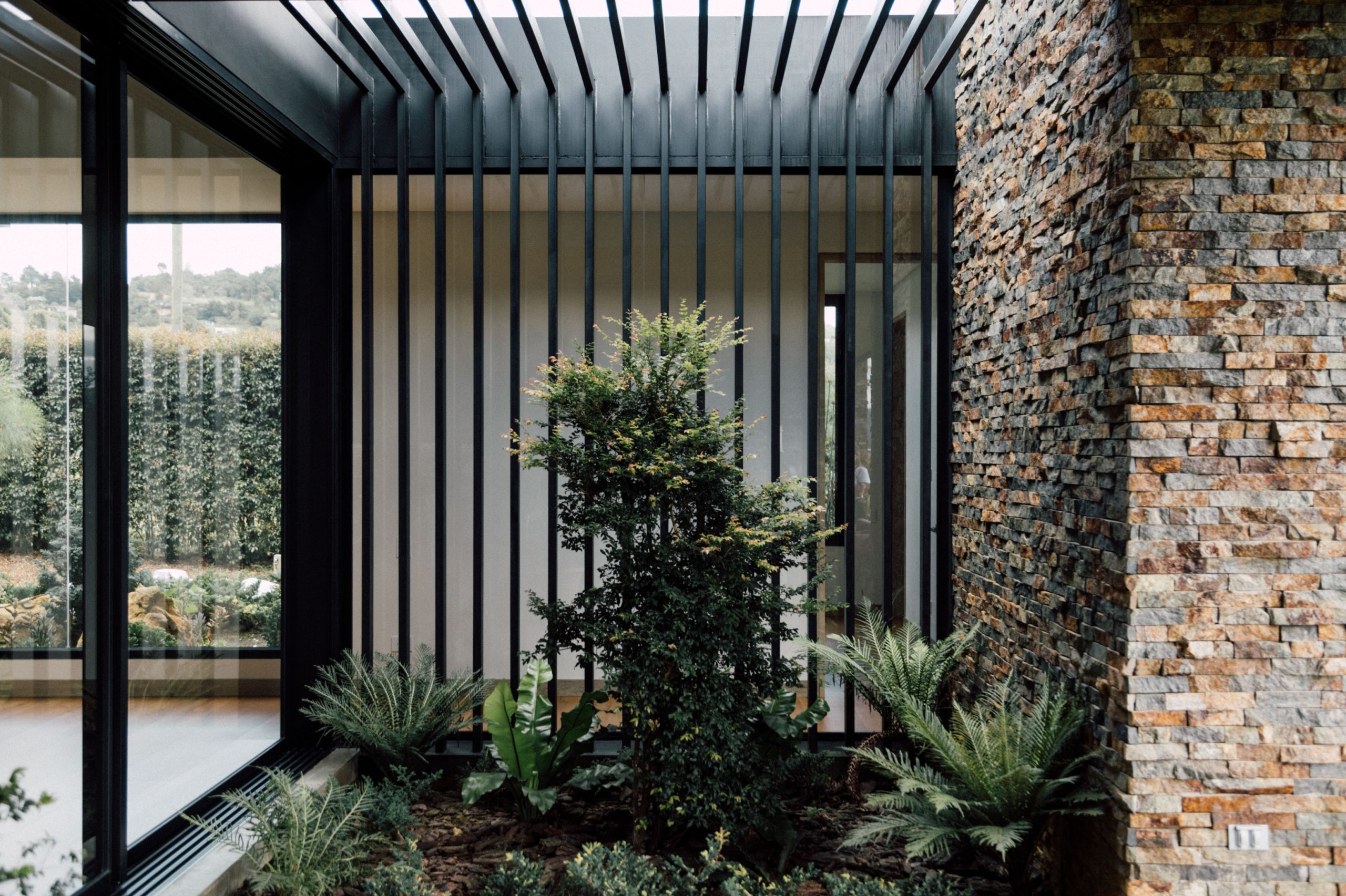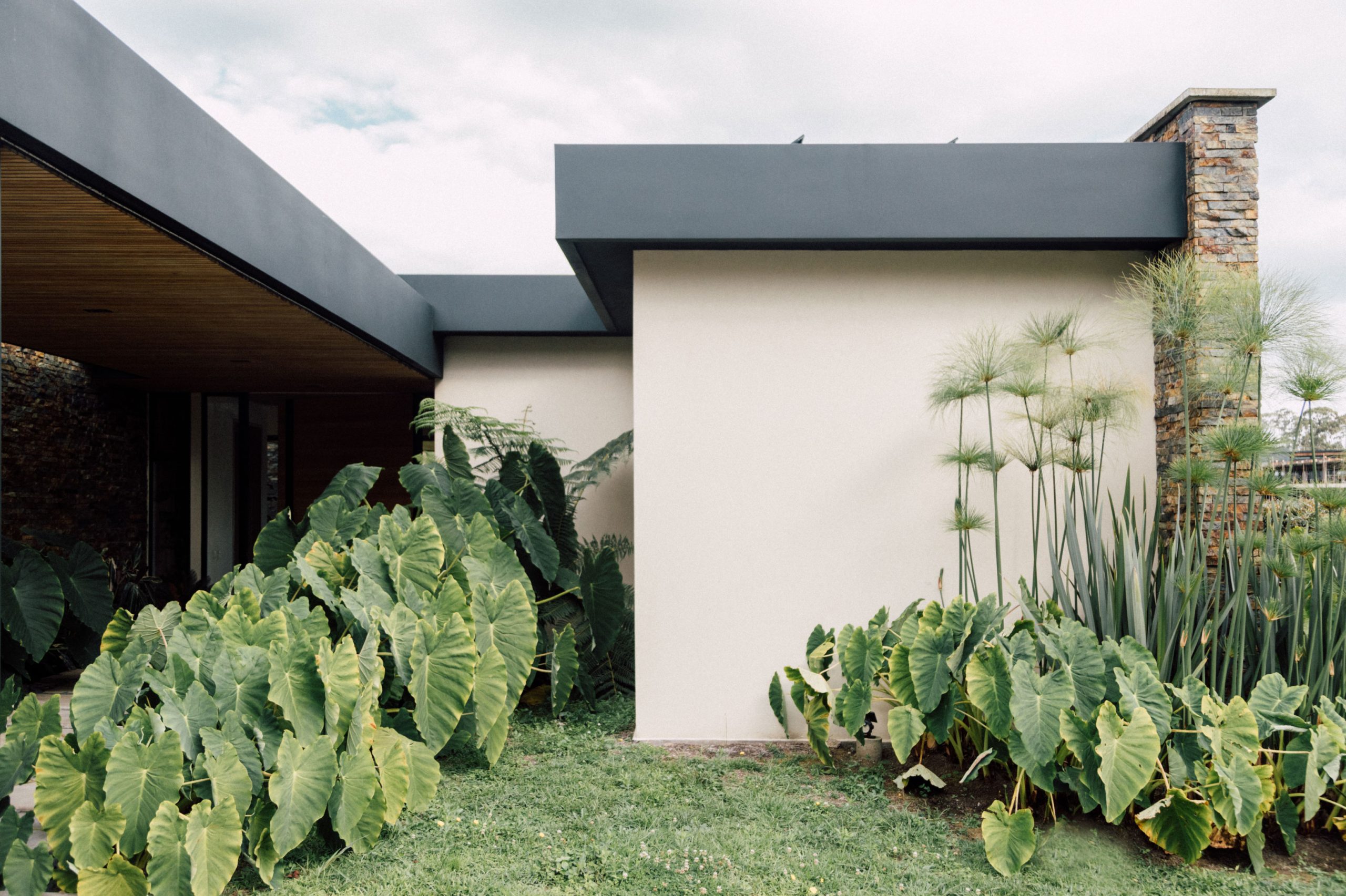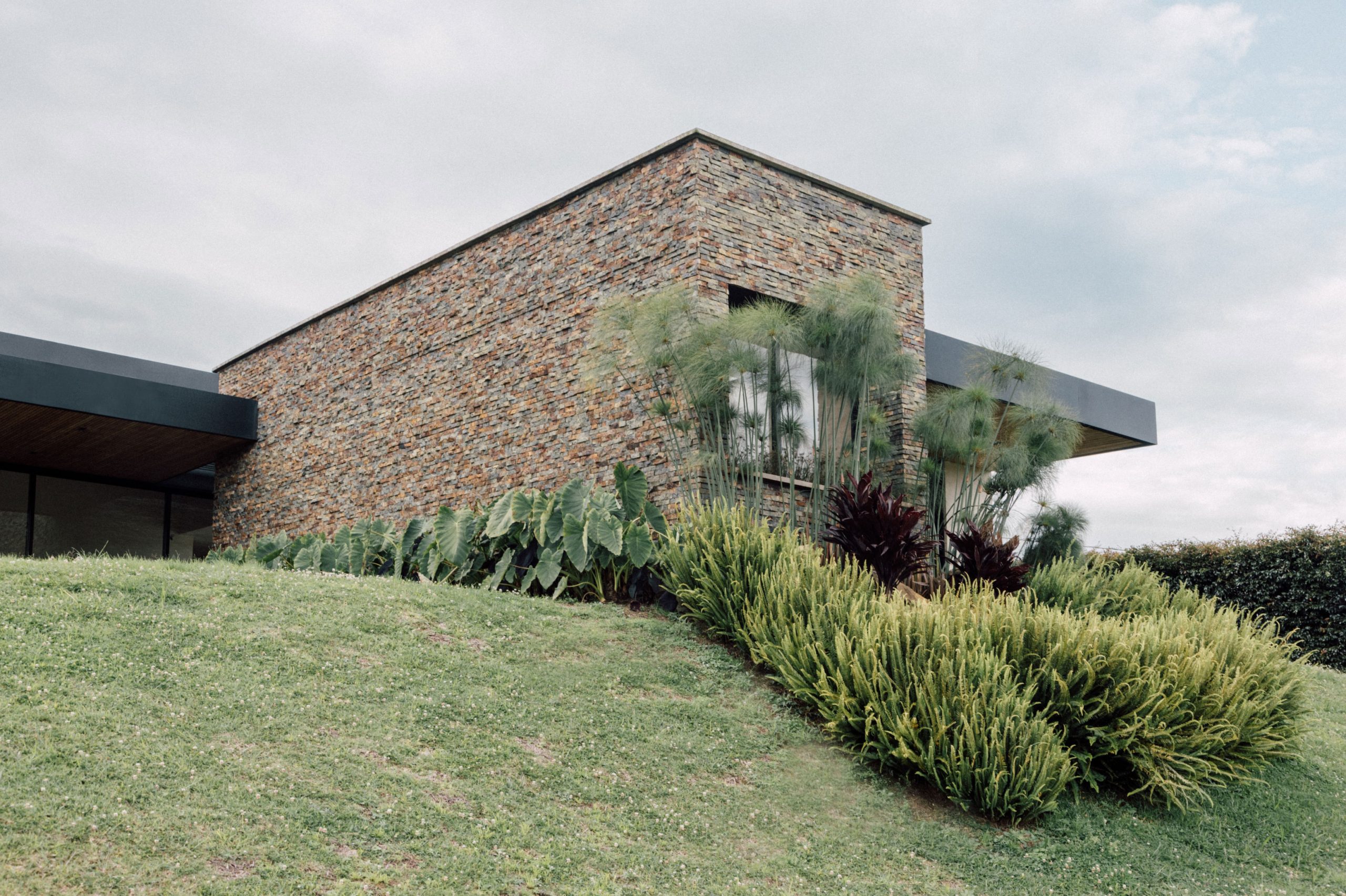Los muros de piedra natural recorren la casa con solidez y textura, integrándola al terreno y estableciendo un vínculo directo con el contexto montañoso. Entre estos muros se insertan volúmenes sobrios que combinan superficies limpias en tonos neutros, cubiertas planas a un agua con voladizos marcados y elementos estructurales en concreto y metal.