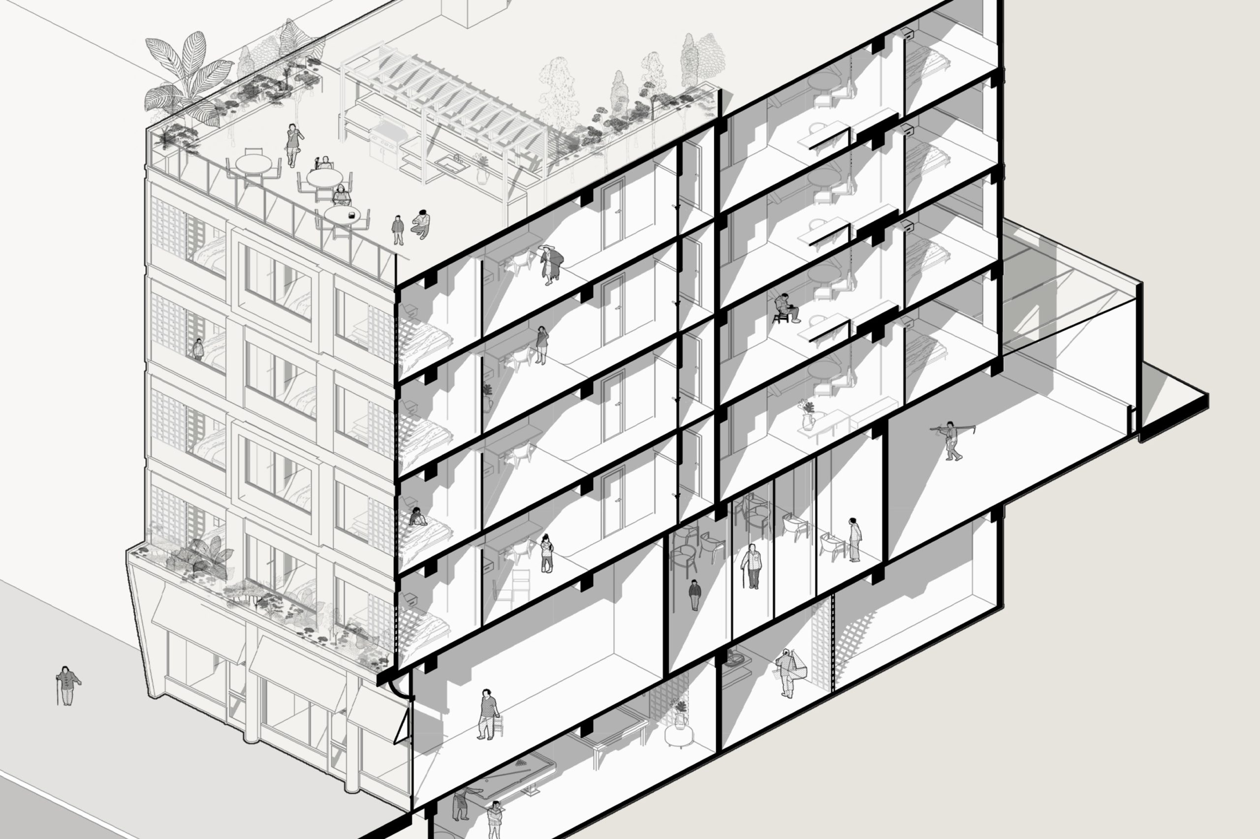 Por otro lado, el vitriblock, con su propiedad de permitir la entrada de luz natural y su capacidad para aislar térmica y acústicamente, introduce un elemento funcional y moderno que responde a las necesidades contemporáneas de habitabilidad. La yuxtaposición de estos materiales tradicionales con acabados en negro crea un juego de contrastes que moderniza la narrativa visual del edificio, otorgándole un aire de sofisticación y dinamismo.